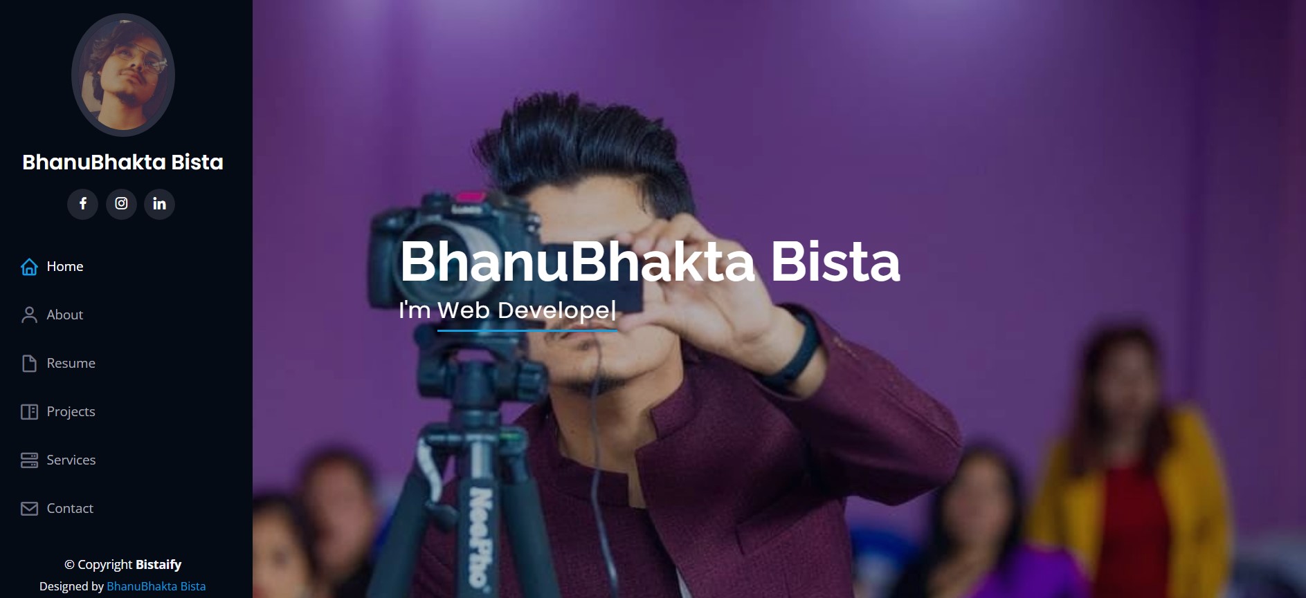 I'm BhanuBhakta Bista from Udayapur Nepal. I am a passonate web developer.1+ years of experience in web development and also have experience in Videography since 2019. I just completed my Bachelor in CSIT. Currently worked with Eydean Inc as a Frontend Developer.